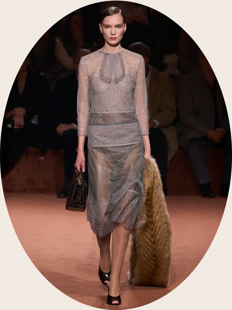 У Dior кружево обретает драматичность: черное, полупрозрачное, с готическим оттенком. У Blumarine оно сочетается с прозрачными тканями, превращая образ в хрупкий и смелый одновременно. Chloé показывает кружево в виде вечерних платьев, которые напоминают ночные сорочки.