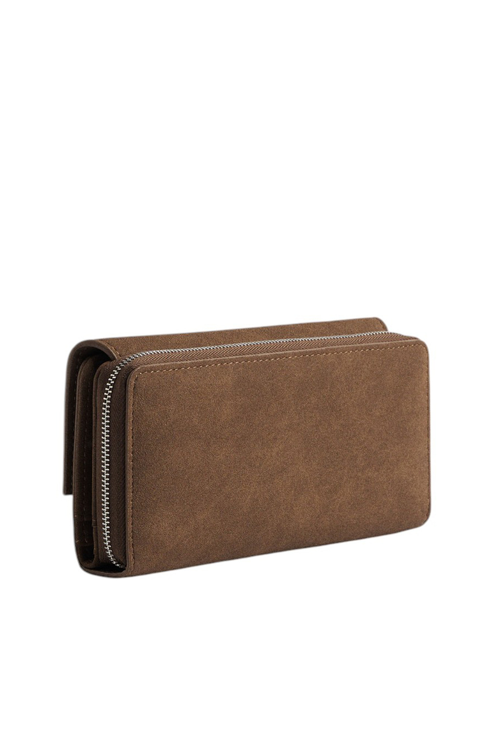 Однотонный кошелек с эффектом замши. Внешний карман на молнии. Клапан на кнопке. Несколько слотов для карт. Размер: 19 x 11 x 4 см.